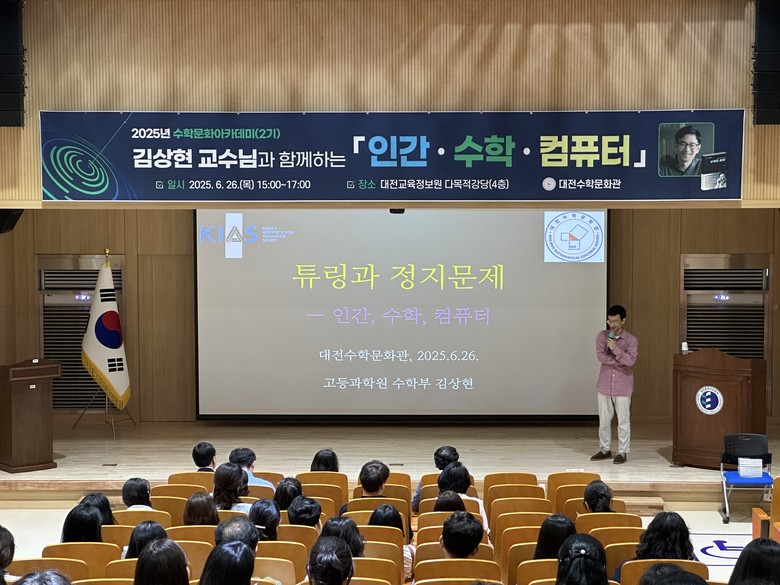 이번에 실시한「수학문화아카데미(2기)」에서는 고등과학원 수학부 김상현 교수를 강연자로 모셨다. 김교수는 오랜 기간 동안 학생과 일반인을 대상으로 수학강연을 이어 왔으며, 현대수학의 다양한 주제를 방송, 서적, 칼럼으로 소개하는 등 국내 수학 문화 확산에 기여한 공을 인정받아 2023년「올해의 최석정상」에 선정된 세계적 수학자이다. 이번 강연에서는「인간, 수학, 컴퓨터」라는 주제로 몰입도 깊은 강연을 펼침으로써 청중의 큰 호응을 이끌었다.