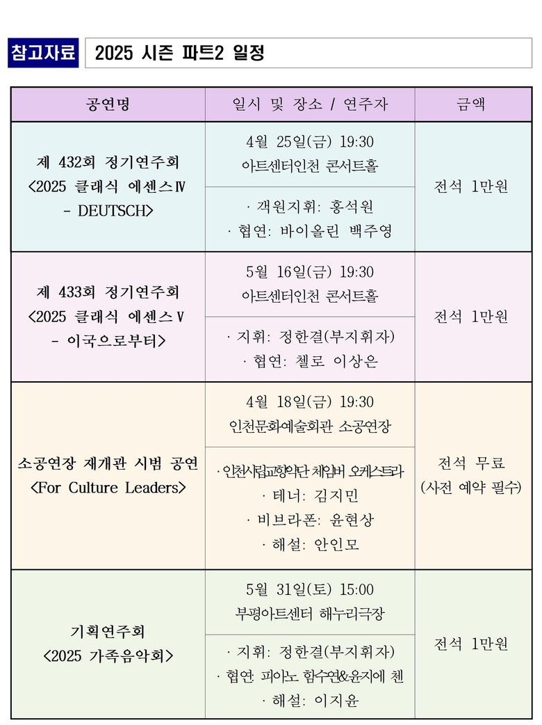 인천시립교향악단(이하 인천시향)이 4~5월에 열리는 공연들로 구성된 ‘2025 시즌 파트2’ 프로그램을 공개한다.