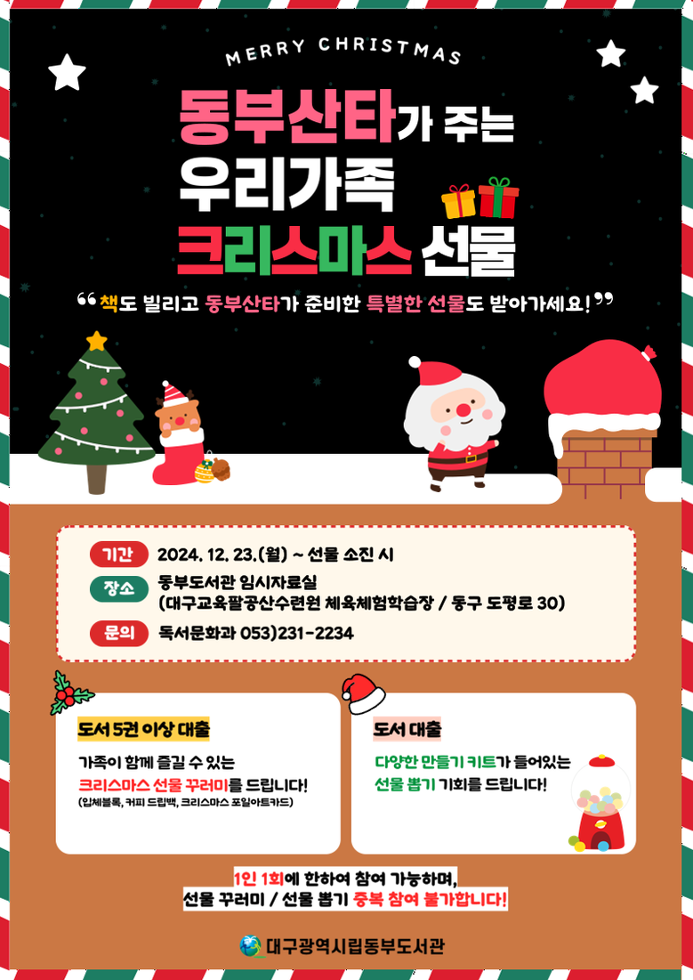 주해숙 관장은 “도서관에서 준비한 크리스마스 선물과 함께 가족이 소중한 추억을 나누고, 따뜻하게 한 해를 마무리할 수 있기를 바란다.”라고 말했다.