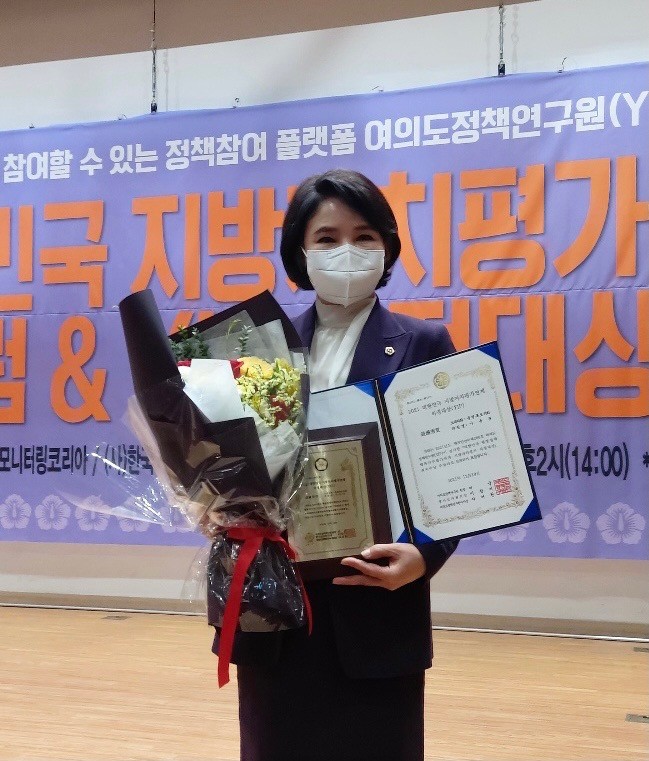 ‘지방자치평가 의정대상’은 여의도정책연구원에서 전국 광역의회의원, 기초의원 등을 대상으로 지방자치 활성화를 위한 주민행복 정책과 지역개선 활동에 기여한 공로를 평가해 시상한다.