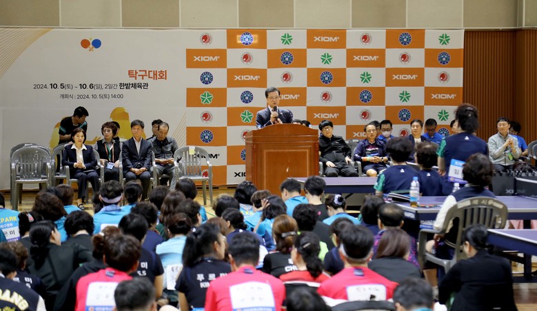 [대전 세계타임즈=이채봉 기자] 대전시의회 조원휘 의장은 5일 대전한밭체육관에서 개최된 ‘제6회 대전광역시협회장기 탁구대회’에 참석해 대회 개최를 성원하고 “그간 갈고닦은 기량을 마음껏 뽐내 더욱 빛나고 성장하는 멋진 모습을 보여주시길 기대하겠다”며 참가 선수들을 응원했다.