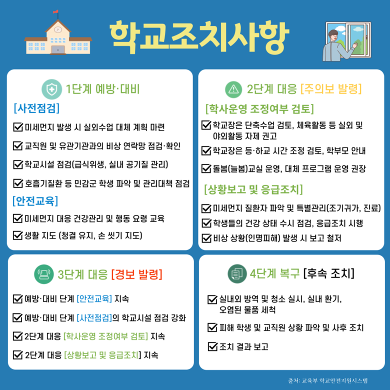 또 학교는 △미세먼지 담당자 지정 △예.경보 상황 상시 확인과 상황 교내 전파 △미세먼지 대응 상황 자체 점검 체크리스트 작성과 제출 △미세먼지 대응 계기 교육 시행 △체육활동 등 실외 활동 자제 △비상저감조치 발령 시 차량 2부제 실시 △공기정화장치 가동 △실외 수업 자제, 수업 시간 조정, 등.하교 시간 조정, 임시휴업 등 실시와 조치 결과 보고 △호흡기 질환 등 민감군 학생 건강 상태 수시 점검 등의 조치를 시행하게 된다.