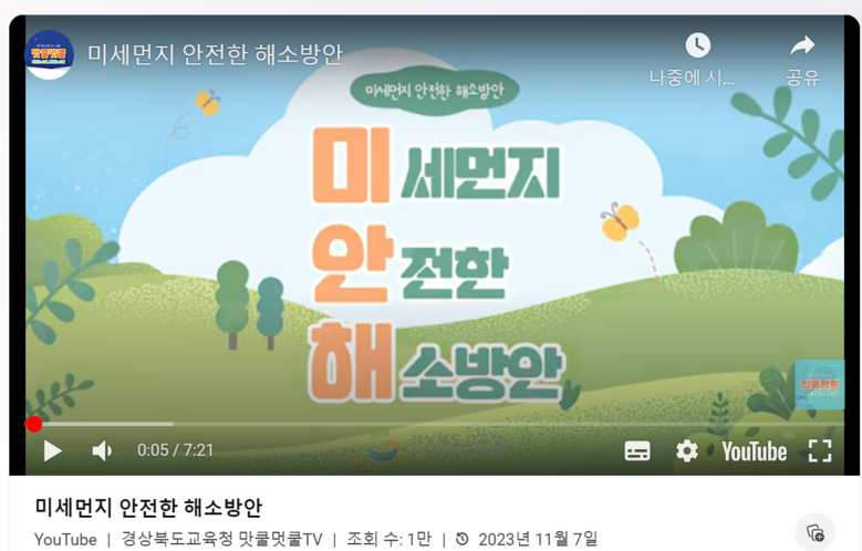 둘째, 미세먼지 대응 교육활동 강화를 위해 학기 초 모든 학교에서 학생과 교직원을 대상으로 미세먼지 대응 계기 교육을 하며, 미세먼지 관련 위해성과 고농도 미세먼지 발생 시 행동 요령을 교육한다. 이를 위해 유튜브 경상북도교육청 맛쿨멋쿨TV의 ‘미안해(미세먼지 안전한 해소방안)’ 영상 등 관련 콘텐츠를 제공한다.