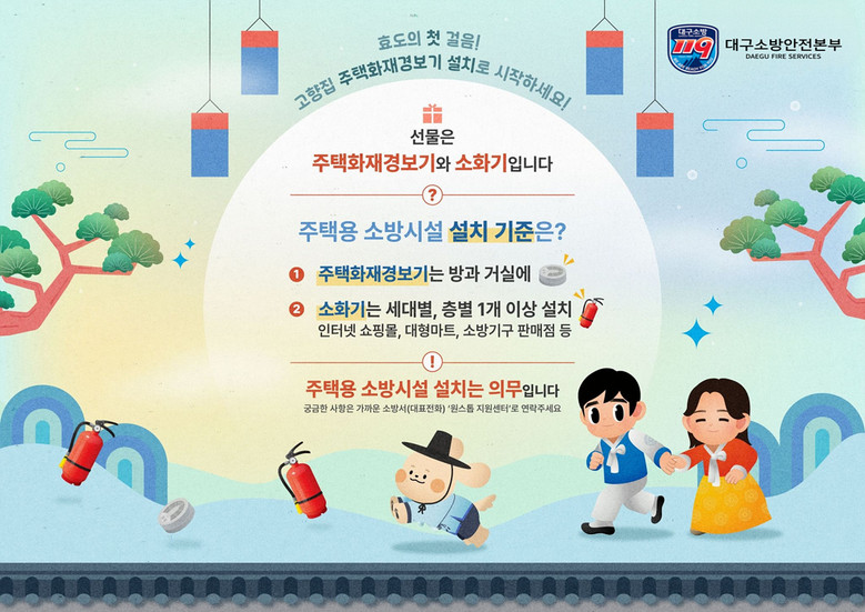 [대구 세계타임즈=한윤석 기자] 대구소방안전본부는 설 명절을 맞아 가족의 안전을 위해 ‘주택용 소방시설’을 선물할 것을 적극 권장하고 나섰다.