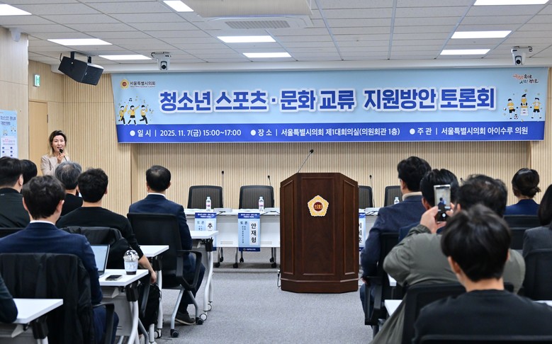 [서울 세계타임즈=이장성 기자] 청소년이 뛰어놀 운동장은 줄고, 서로의 문화를 배우는 무대가 더 필요해지는 시대다. 이에 서울특별시의회 아이수루 문화체육관광위원회 부위원장(더불어민주당·비례)이 7일 오후 3시, 서울시의회 의원별관 제1대회의실에서 ‘청소년 스포츠 문화교류 지원 방안 토론회’를 개최했다.