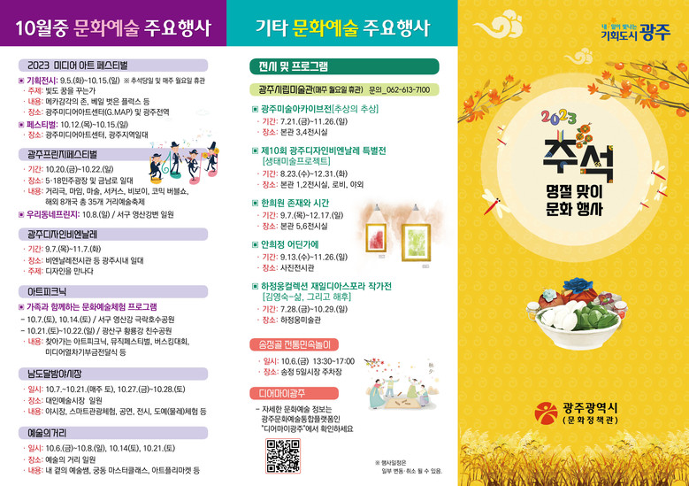 - 광주미디어아트 기획전시·디자인비엔날레 등 다양한 볼거리 [광주 세계타임즈=손권일 기자] 광주광역시(시장 강기정)는 추석 연휴에 온 가족이 함께 추억을 만들 수 있는 다채로운 문화행사를 마련했다고 25일 밝혔다.