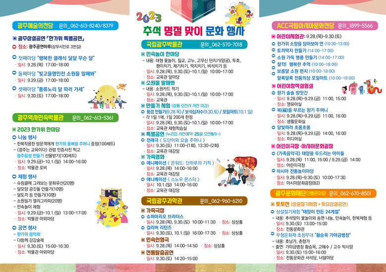 국립광주과학관에서도 가족극장, 민속인형극, 전통탈춤공연을 즐길 수 있으며, 광주역사민속박물관은 ‘2023년 추석맞이 한마당’을 준비했다.