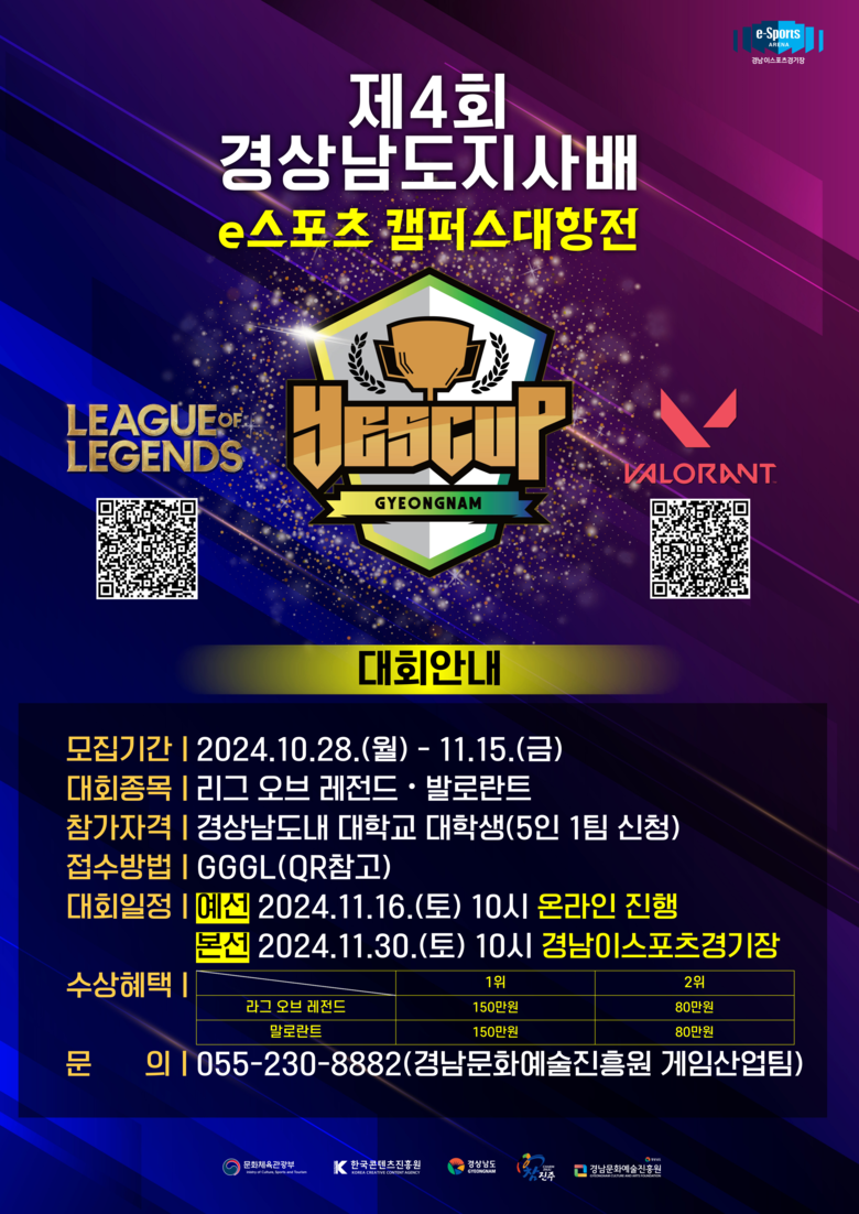 먼저 ▲도지사배 이스포츠 캠퍼스 대항전은 지난 11월 6일 온라인 예선(리그오브레전드)을 거쳐 결승에 진출한 경남대학교(짱구는 못말려)팀과 경상국립대학교(월세로이드)팀이 학교의 명예를 걸고 치열한 승부를 펼칠 예정이다. 이어 발로란트 종목에서는 경남대학교 내 코로나20팀과 발꼬락꼼지락팀이 결승에서 맞붙게 된다.
