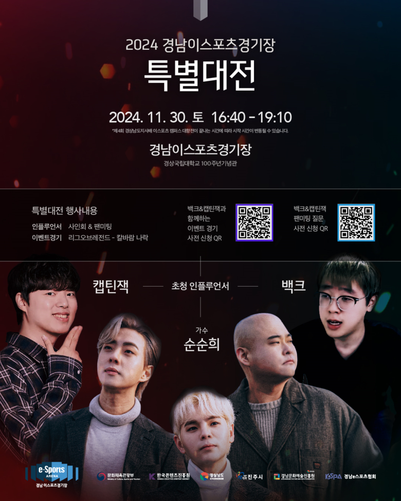 ▲이스포츠 특별대전에서는 인플루언서 캡틴잭, 백크와 함께하는 리그오브레전드(칼바람 나락) 이벤트 경기와 사인회가 준비되어 있다. 이벤트 경기에 참여를 원하는 분은 홈페이지 QR코드를 통해 사전 신청할 수 있다.