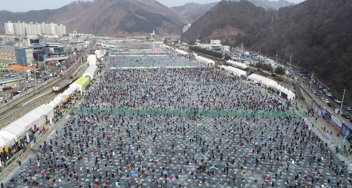 [화천군=세계타임즈 김민석 기자] 2019 화천산천어축제장이 12일 주말을 맞아 발디딜틈없이 관광객들로 성황을 이루고 있다.