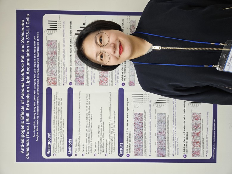 고은정 박사는 ‘작약 및 오미자 추출물의 3T3-L1 세포 내 지질축적 억제 효과’를 주제로 연구 결과를 발표했으며, 작약과 오미자 추출물이 지방세포 내 지질축적을 효과적으로 억제함으로써 비만 예방 및 체지방 감소 기능성 소재로의 활용 가능성을 제시한 점에서 높은 평가를 받았다.