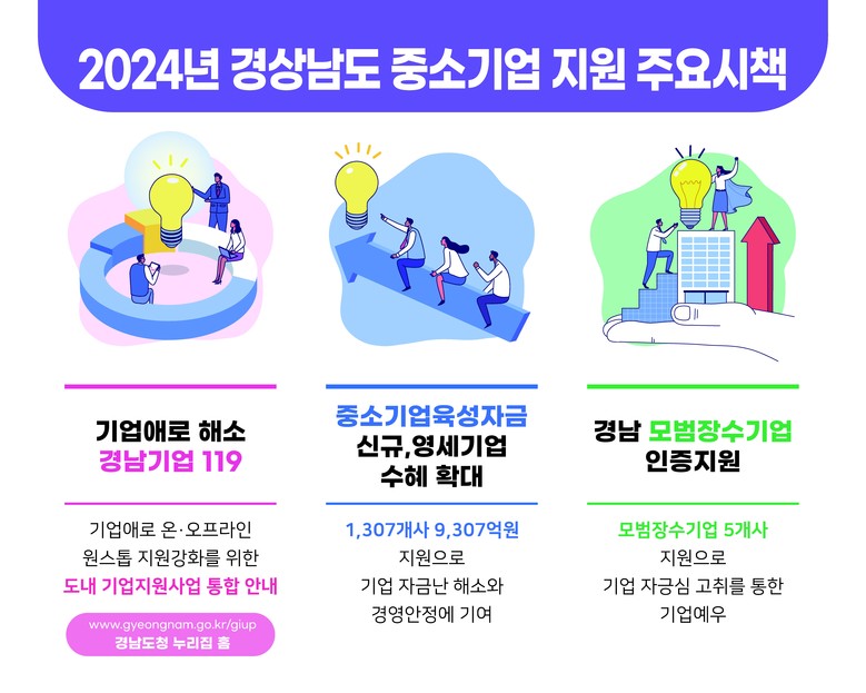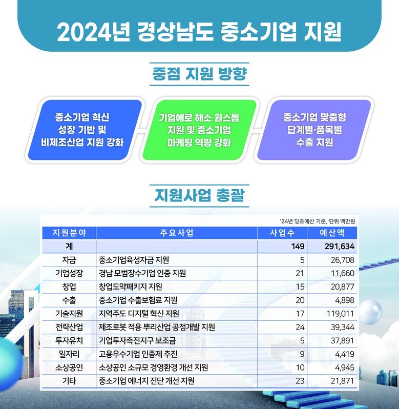 경남도는 올해 기업 성장단계별 지원정책 추진과 제조업과 비제조업 동반성장, 수출 마케팅, 영세 중소기업 중대재해 예방 안전디자인 지원 등 149개 사업에 약 3천억 원의 기업 지원정책을 추진하여 기업 성장의 사다리 지원 체계를 구축하였다.