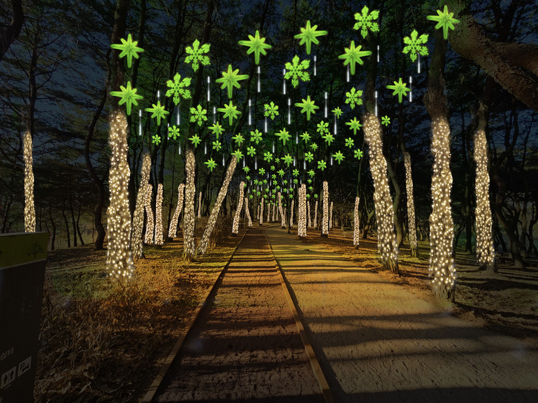 천년숲 산책로에는 은하수 조명과 녹색 별·눈 결정 오브제, 눈이 내리는 듯한 스노우폴 조명 등 총 640개의 경관조명이 설치되며, 특히 스노우풀 조명은 20초 간격으로 점멸되도록 연출돼, 고요한 숲길에 리듬감을 더한다.