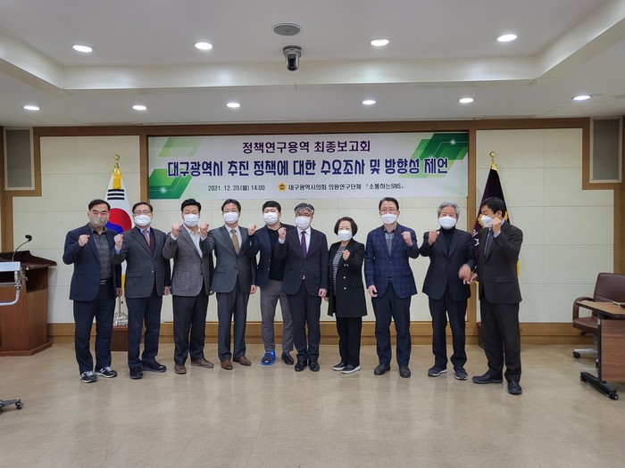 [대구=세계타임즈 한성국 기자] 대구시의회 의원연구단체 ‘소통하는 SNS’(대표 이태손 의원)가 정책연구과제로 추진한 ‘수요자 조사를 통한 대구시 신규정책과제 발굴’연구용역 최종보고회를 열어 연구결과로 도출된 대구시의 정책과제를 발표했다.