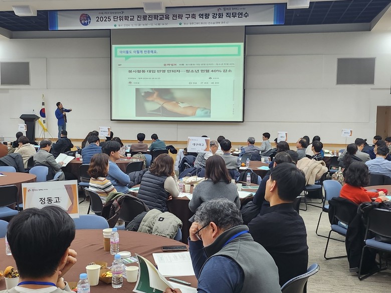 [대구 세계타임즈=한윤석 기자] 대구시교육청(교육감 강은희)은 12월 13일(금)부터 14일(토)까지 경주교원드림센터에서 일반계고 30개 교와 대구온라인학교의 교감·리더교사* 등 156명이 참여해 ‘2025 단위학교 진로진학교육 전략 구축 역량 강화 직무연수’를 운영한다.