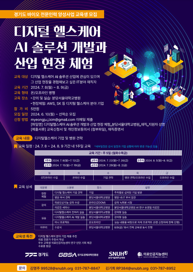 이번 교육은 ‘경기도 바이오 전문인력 양성사업’의 일환으로, 의료AI 솔루션 국책사업 ‘닥터앤서 2.0’ 등을 주관하며 디지털 헬스케어 및 의료 인공지능 분야에서 선도적 입지를 구축하고 있는 분당서울대병원에서 직접 관련 분야 재직자 및 구직자를 교육하고자 마련됐다.