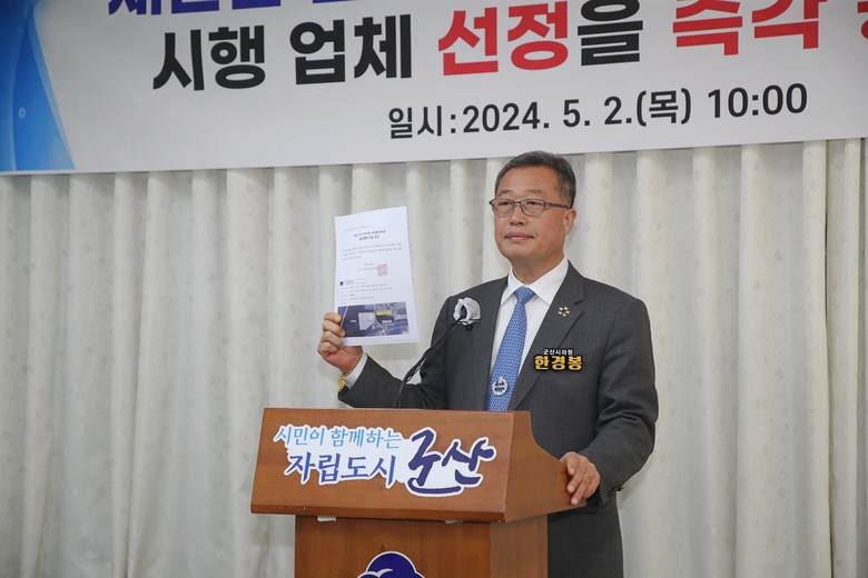 한경봉 의원은 군산시가 시민발전 주식회사 대표이사 선정과 외부 전문가로 상임이사를 구성하고 그 이후에 수상태양광 시공업체를 선정해야 하며 새만금 수상태양광사업이 제대로 추진되기 위해서는 반드시 이 부분이 선행되어야 한다며 새만금 태양광 사업의 당위성과 군산시의 신뢰도가 회복되고 새만금 수상태양광 사업의 발전적 미래를 만들어 가기 위해 비리의 온상인 새만금 육상태양광사업의 검찰 비리 수사 결과가 명명백백하게 드러날 때까지 새만금 수상태양광 발전사업 시행업체 선정을 즉각 중단할 것을 강력히 촉구했다.
