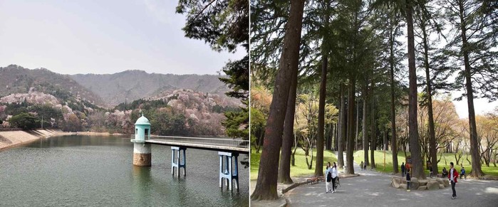 ▲ 양산 법기수원지 = 청정 수질을 자랑하는 법기수원지는 침엽수림인 측백나무와 편백을 비롯해 높이 30~40m에 달하는 개잎갈나무, 둑 위에 있는 수십년 된 반송나무가 절경으로 꼽힌다.