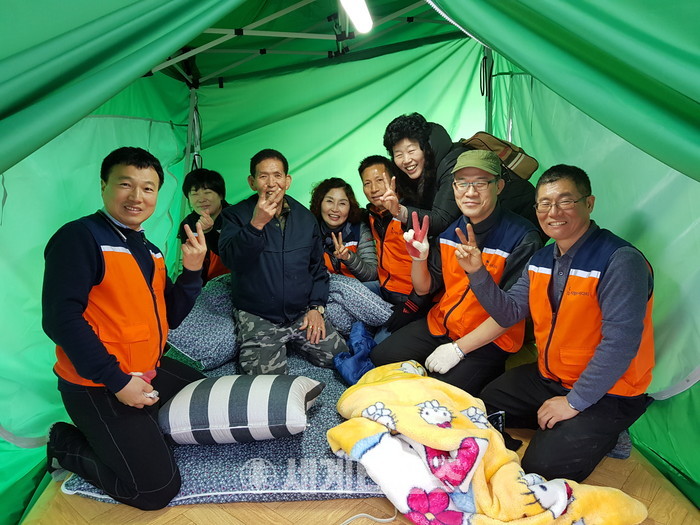 이날 봉사에는 나눔봉사단 유희자 단장, 산악회 김호현 회장, 운영위원회 박영준 회장을 비롯해서 회원 20명이 추운날씨에도 바닥정리와 파래트 설치 후 2중 장판을 깔은 후에 전기장판 및 겨울이불과 천막으로 마무리를 하면서 사회적 효행을 실천 하였다.