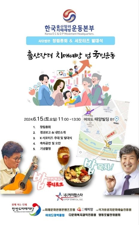 2024년 6월 15일 동여의도 태양빌딩에서 (사)한국출산장려치매예방운동본부의 사단법인 결성식이 이루어질 예정으로, 이를 위해 여의도대박클럽 회원들이 모두 모였다.