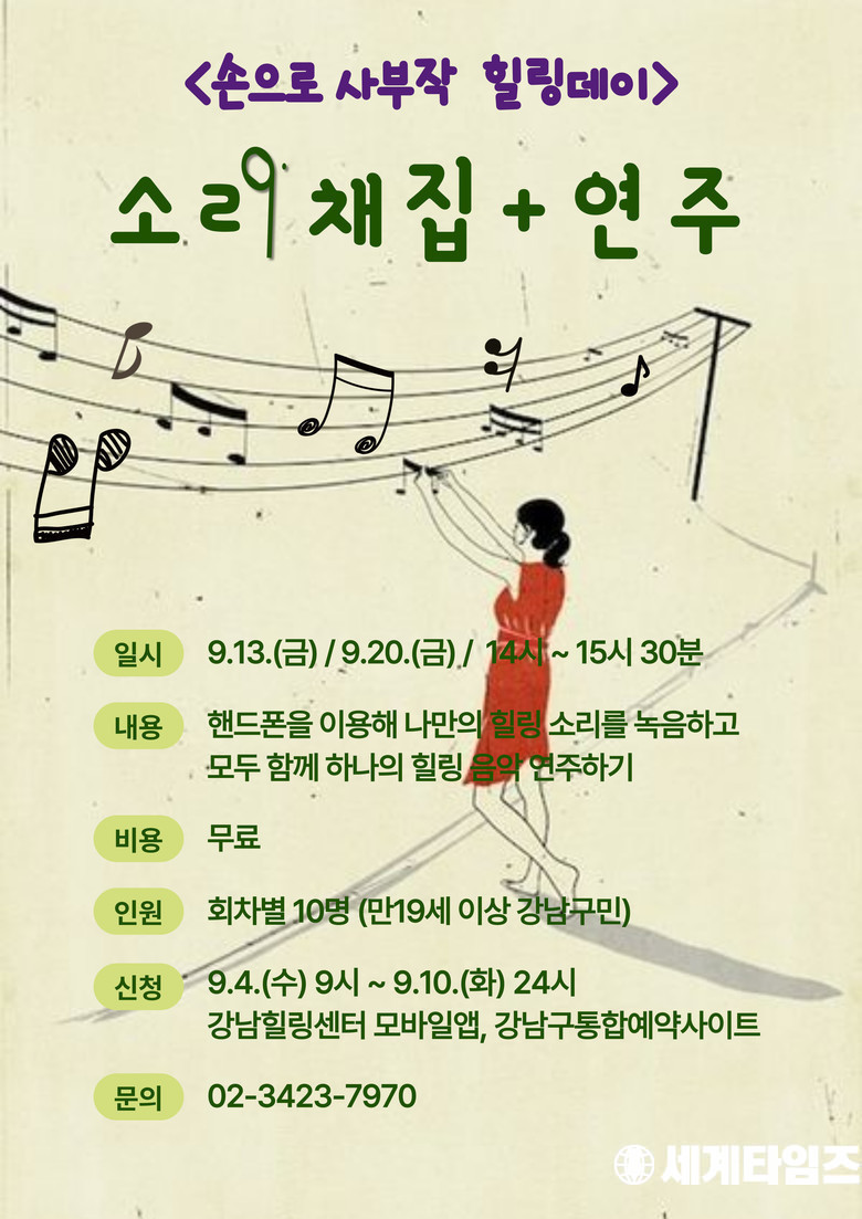 소리 채집 프로그램은 나만의 힐링 소리를 핸드폰에 녹음하고, 참가자들이 채집한 소리를 모아 하나의 음악으로 만드는 이색 강좌다. 한국대중음악상 재즈&크로스오버 부문을 수상하고 뉴욕 OMI국제아트센터 레지던시 아티스트로 선정돼 서울시립미술관 등에서 다양한 프로그램을 운영한 지박 작가를 섭외했다. 수업은 개포점(삼성로 3길 39)에서 9월 13일, 20일 14시~15시 30분에 진행한다.