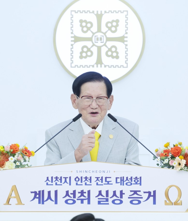 ▲6일 열린 ‘신천지 인천 전도 대성회’에서 힘주어 강연하는 이만희 총회장 [사진 제공 = 신천지예수교회]