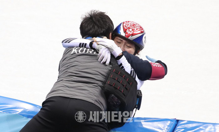 쇼트트랙 스피드 스케이팅 경기가 있던 20일. 고양시청 소속 김아랑 선수가 경기 직후 기쁨의 눈물을 흘리고 있다. 이날 김아랑 선수가 속한 쇼트트랙 여자 대표팀은 3000m 계주에서 금빛 질주를 펼치며 세계 최강 전력을 과시했다.