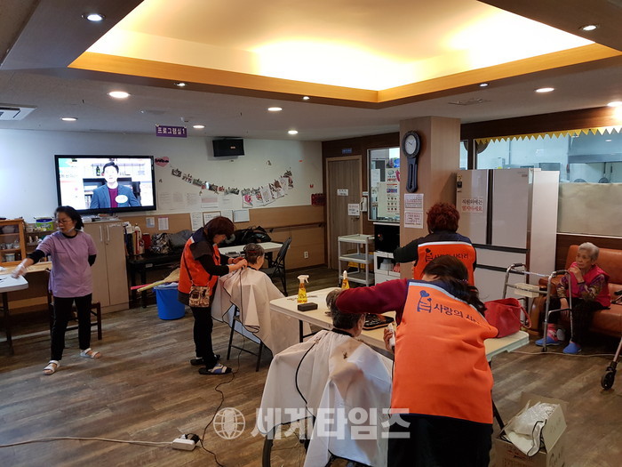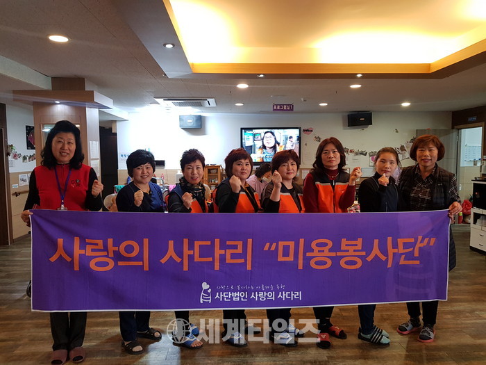 [대전=세계타임즈 이장성 기자] 6천명 봉사단체인 SNS 밴드모임 사랑의 사다리 밴드(리더 이정제)는 7일 오전10시 대덕구 비래동에 위치한 실버케어노인요양원(원장 김숙희)에서 치매 및 와상 어르신들 50분께 미용봉사로 사회적 효행을 실천하였다