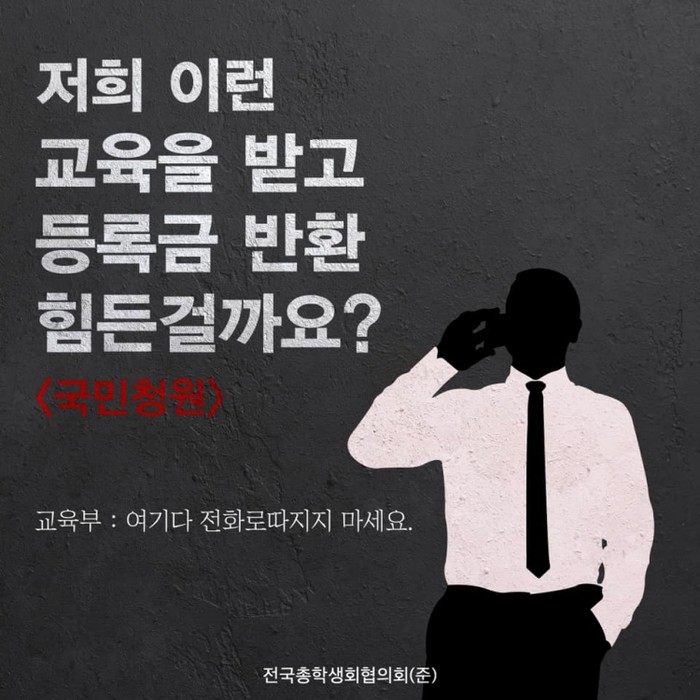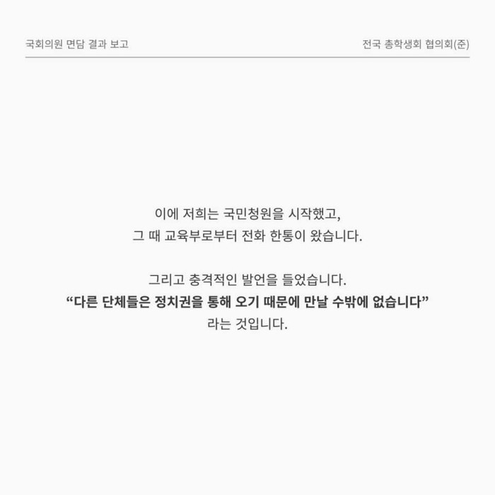 지난 6월 전총협은 “교육부에 면담을 요청했으나 교육부 관계자는 법인격의 대표나 국회의원을 통해서만 학생대표를 만나줬다”며 “또한 관계자가 ‘의원과 국회, 법인격 대표가 아니면 만나줄 수 없다’며 권위적인 모습을 보였다”고 비판했다.