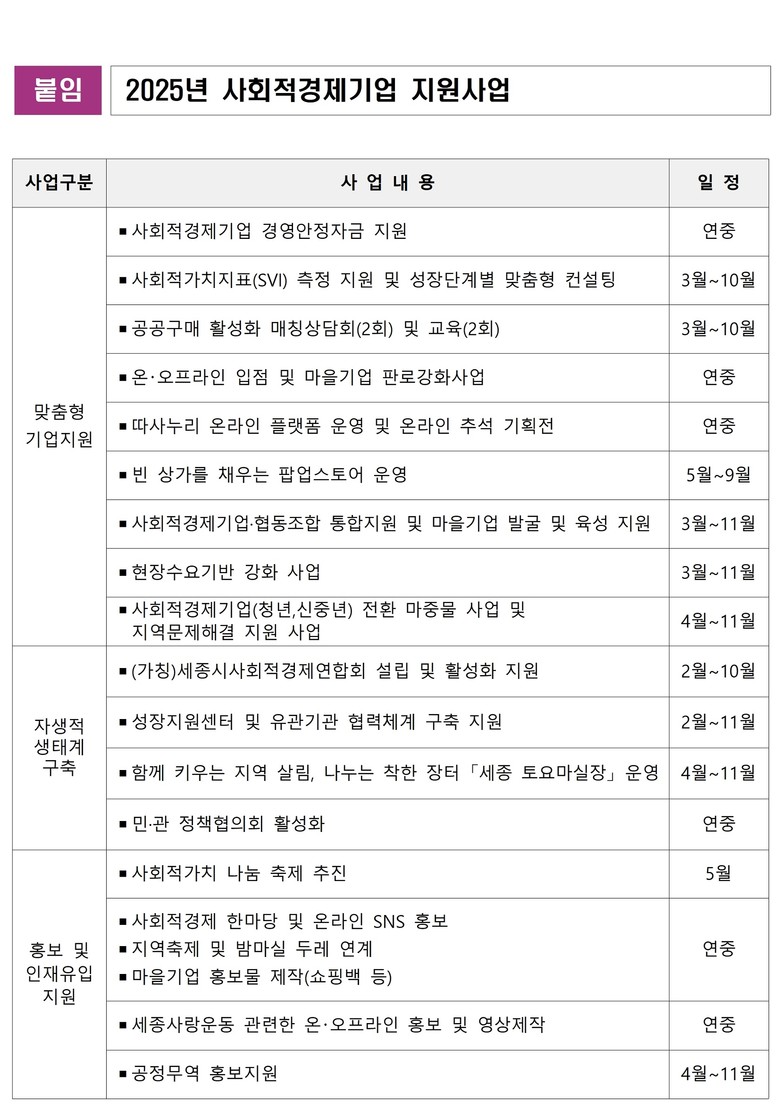 자생적 생태계 구축 사업으로는 (가칭)세종시사회적경제연합회 설립 및 활성화 지원, 성장지원센터 및 유관기관 협력체계 구축 지원 등이 포함됐다.