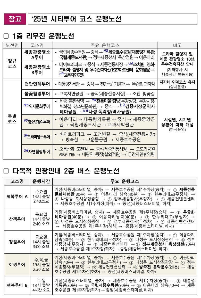 김려수 문화체육관광국장은 “세종시티투어 버스는 세종의 역사, 문화, 자연을 한 번에 즐길 수 있는 최적의 관광 서비스가 될 것”이라며 “이번 코스 개편을 통해 보다 많은 시민과 관광객이 세종의 숨은 매력을 발견하길 바란다”고 말했다.