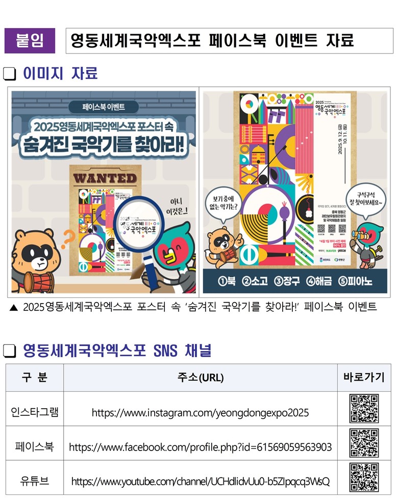 한편, 2025 영동세계국악엑스포는 ‘국악의 향기, 세계를 물들이다’라는 주제로 2025년 9월 12일부터 10월 11일까지 한 달간 충북 영동군 레인보우힐링관광지 및 국악체험촌 일원에서 개최된다. 세계 30개국이 참가하는 국제 행사로, 공식행사(개·폐막식), 주제관 및 전시관 운영, 국악 및 세계 전통음악 공연, 다양한 체험 프로그램 등이 다채롭게 펼쳐질 예정이다.