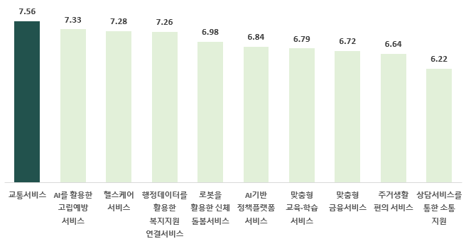 AI 기반 공공서비스 필요성은 교통서비스(7.56점)가 가장 높았으며, 고립예방 서비스(7.33점), 헬스케어 서비스(7.28점)가 뒤를 이었다.