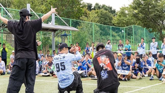 | ▲ 지난 3월 29일 ‘제20회 구로구협회장기 족구대회’에서 참가팀이 식전공연을 선보이고 있다. |