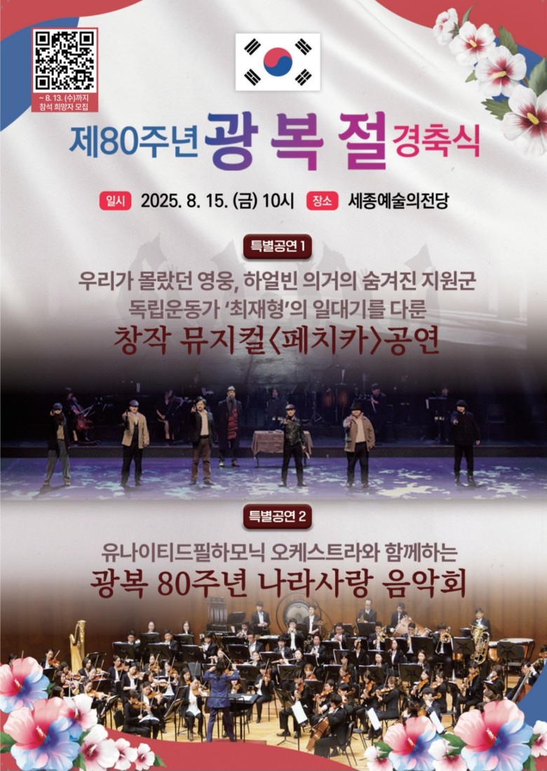 특히 경축공연은 유나이티드 필하모닉 오케스트라 지휘자 김봉미와 테너 이규철, 소프라노 정꽃님, 바이올리니스트 김현지 등 40여 명의 연주자가 8곡의 오케스트라 공연을 통해 광복 당시의 환희와 감동을 웅장한 선율로 전달한다.