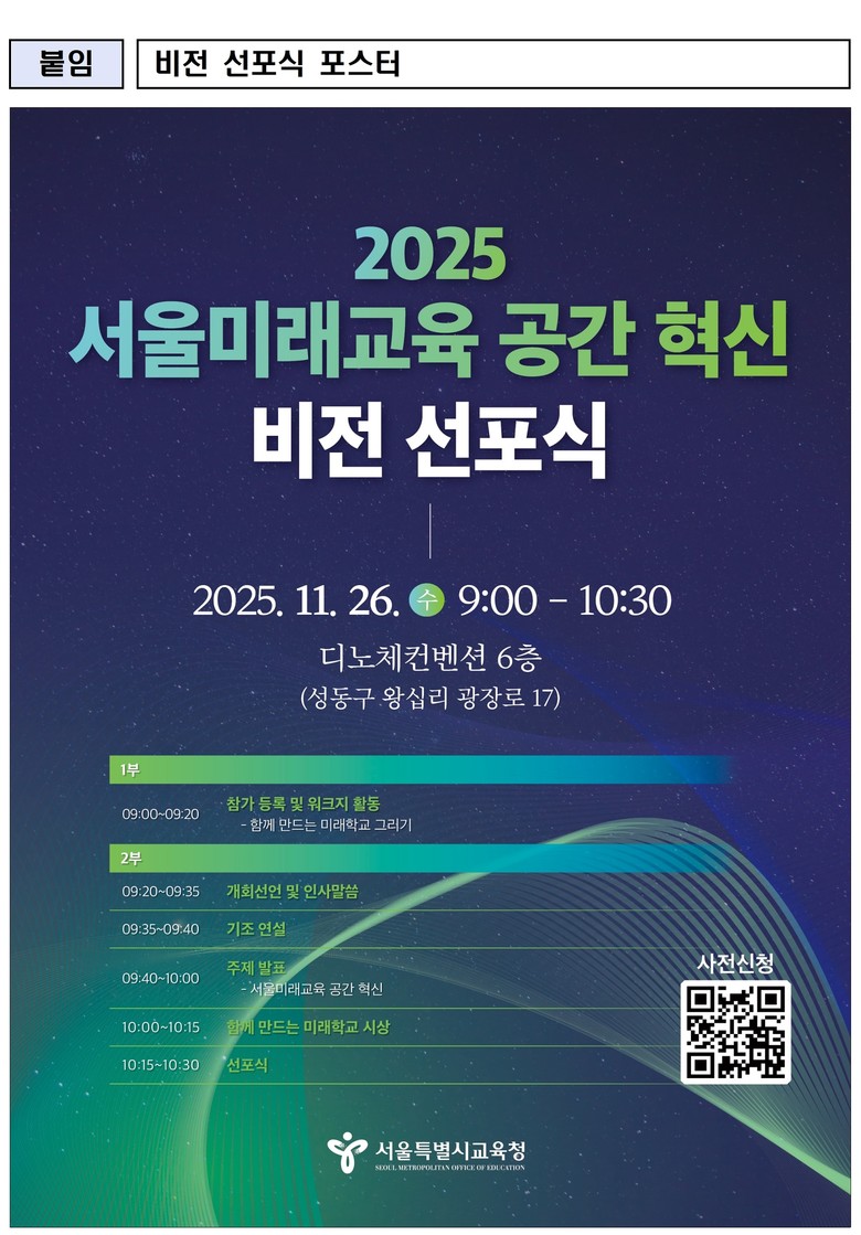 한편 이날 행사에는 상반기 ‘서울미래교육 공간 혁신 TF’에 참여했던 김인호 산림청장과 최호정 서울시의회 의장이 축사를 전하며, 비전이 지향하는 학교 공간 변화의 필요성과과 기대를 함께 나눌 예정이다.