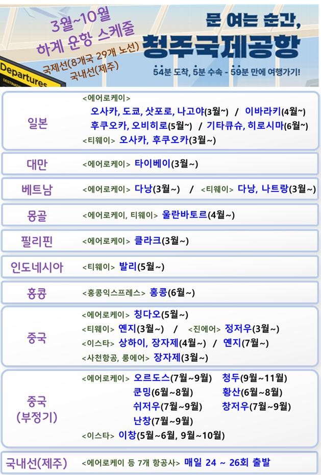 이에 따라, 오르도스(에어로케이 / 7월~9월), 청두(에어로케이 / 9월 ~11월), 이창(이스타 / 5월~6월, 9월~10월), 쿤밍(에어로케이 / 6월 ~8월), 황산(에어로케이 / 6월~8월), 쉬저우(에어로케이 / 7월~9월), 창저우(에어로케이 / 7월~9월), 난창(에어로케이 / 7월~9월) 등 청주와 중국을 연결하는 부정기노선도 다양하게 검토 중인 것으로 전해졌다.