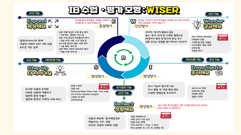 - 교육과정: 국가 교육과정에 PYP 프레임워크를 접목하여 탐구단원 및 학교별 탐구프로그램 구성