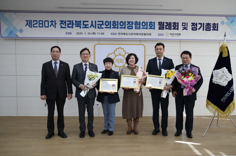 [익산=세계타임즈 이정술 기자] 익산시의회(의장 최종오) 정영미(삼기, 영등2, 삼성), 조은희 의원(함열, 황등, 함라, 웅포, 성당, 용안, 망성, 용동), 최재현(모현, 송학)이 25일 열린 제280차 전북시·군의회의장협의회(회장 이기동) 월례회에서 ‘지방의정봉사상’을 수상했다.