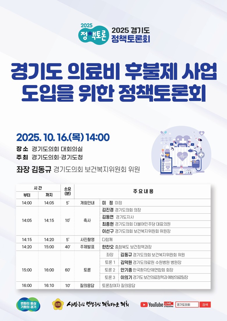 이번 토론회는 충북 의료비후불제의 성공 사례를 공유하고, 경기도 내 제도 도입 방향을 모색하기 위해 마련된 자리로, 경기도의회 보건복지위원회 김동규 의원이 좌장을 맡아 주제 발표와 패널토론, 질의응답 순으로 진행되었다.