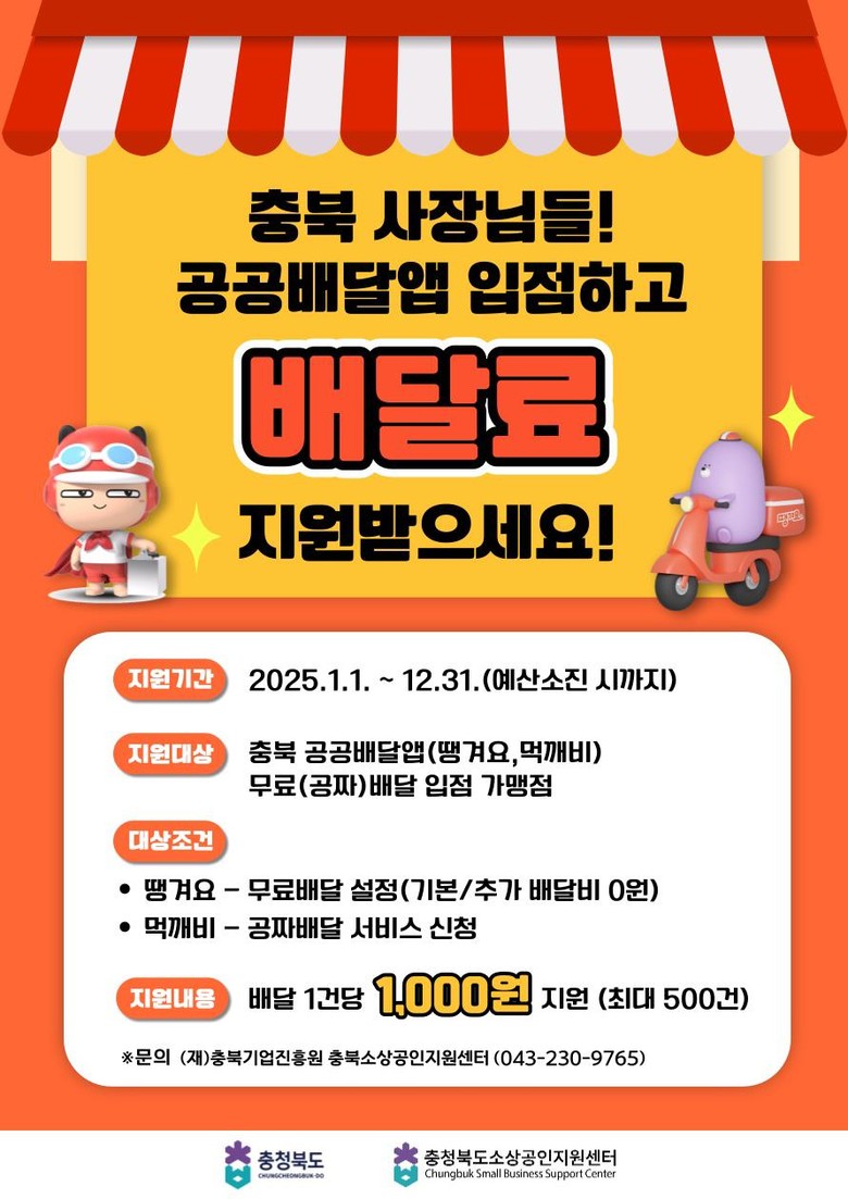 대상은 충청북도 공공배달앱(땡겨요·먹깨비) 무료(공짜)배달에 입점한 소상공인으로 공공배달앱에서 발생한 주문 1건당 1,000원씩 월별 정산해 다음 달에 가맹점주에게 지급하며, 예산 소진 시까지 가맹점주 1인당 최대 50만원을 지원한다.