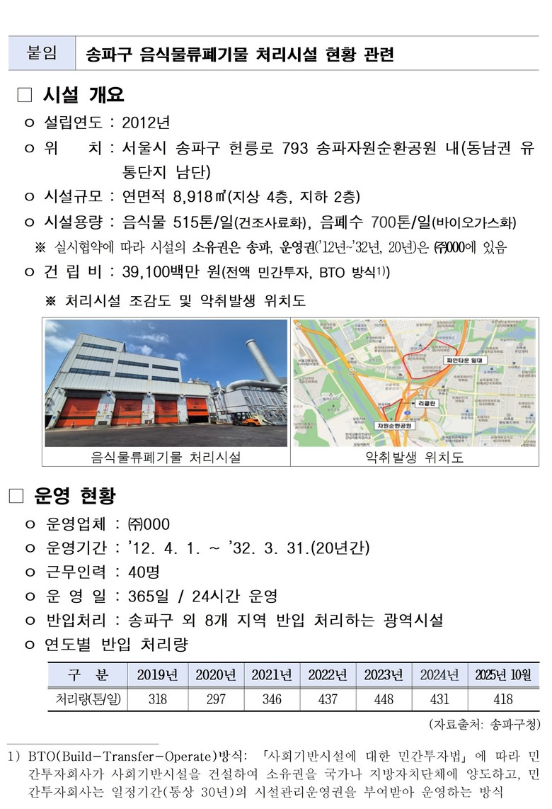 우선 관외 폐기물이 구청 승인 없이 반입 처리되고 있는지 여부에 대해서는 2024년 송파구 감사부서에서 실태 조사를 한 이후부터 관외에서 반입되고 있는 음식물류폐기물은 모두 구청의 승인하에 정상적으로 이루어지고, 미승인 반입은 없는 것으로 확인되었다.