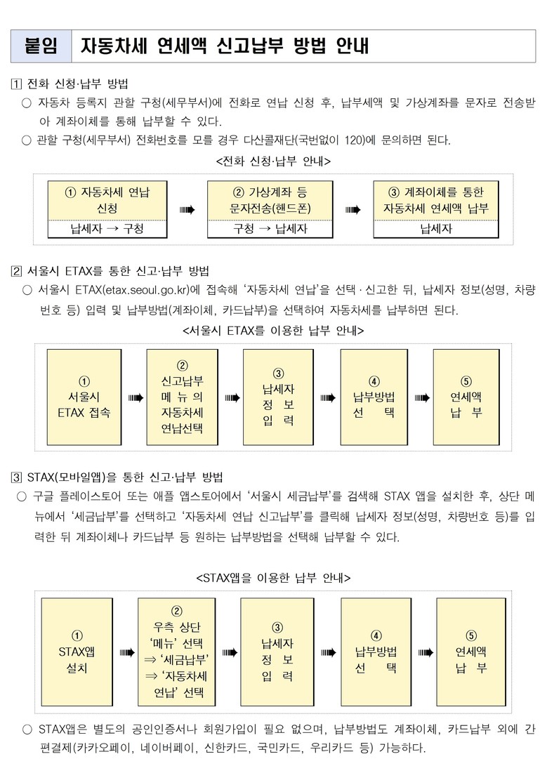서울시는 전년도까지 자동차세 연세액 신고·납부 신청을 한 납세자 편의를 위해 『2026년도 1월 자동차세 연세액 신고납부서』를 일제히 발송 하였으며, 1월 16일(금)부터 2월 2일(월)까지 서울시 ETAX(etax.seoul.go.kr) 및 STAX(모바일 앱) 등 전자 납부 수단을 통해 신고납부 가능하다.