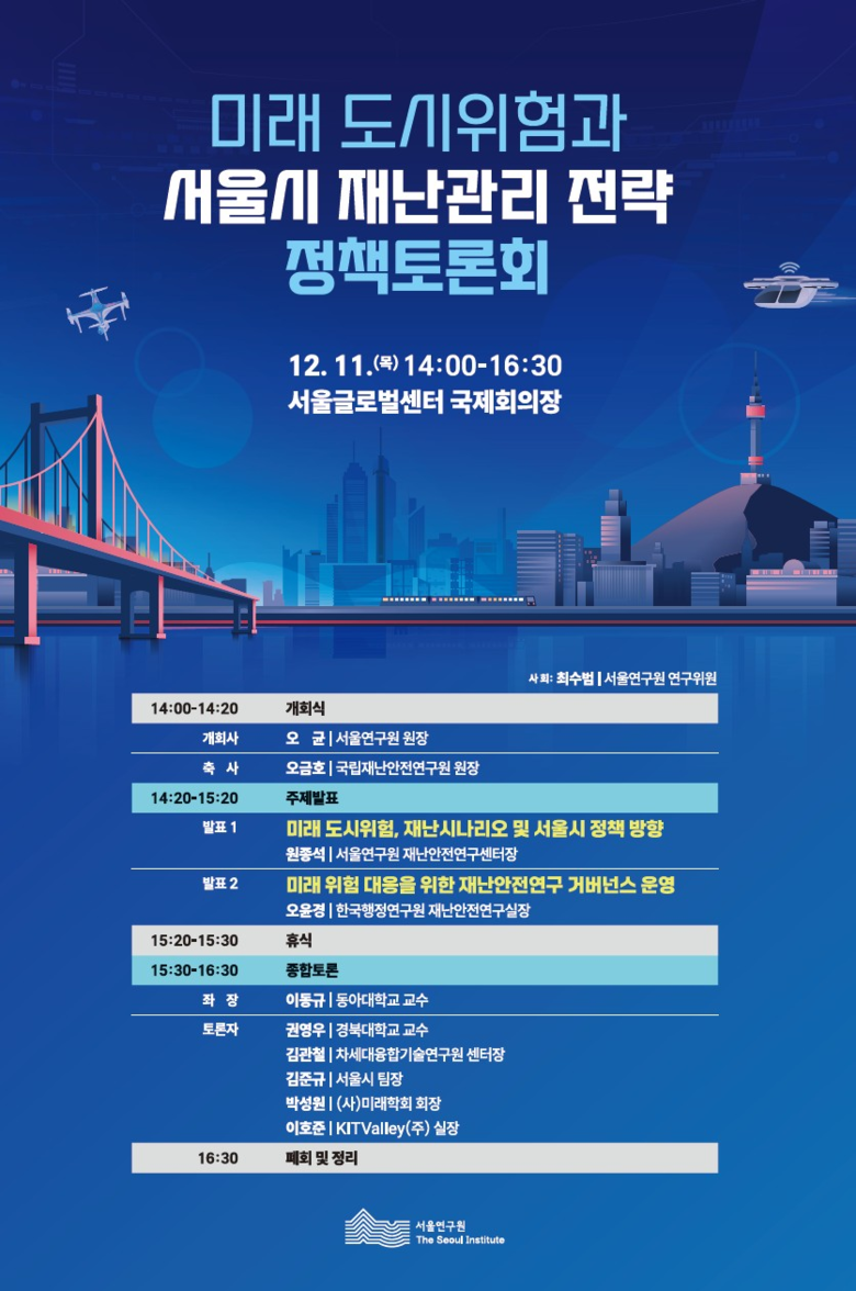- 회복탄력성 중심의 서울형 재난관리 체계와 중·장기 정책 방향 제시 기대 [서울 세계타임즈=이장성 기자] 서울연구원은 기후변화, 초고령화, 기술 고도화 등으로 복합·대형화되는 미래 도시위험에 선제적으로 대응하기 위해 2025년 12월 11일(목), 오후 2시 서울글로벌센터 국제회의장에서「미래 도시위험 대응을 위한 서울시 재난관리 전략」을 주제로 정책토론회를 개최한다.