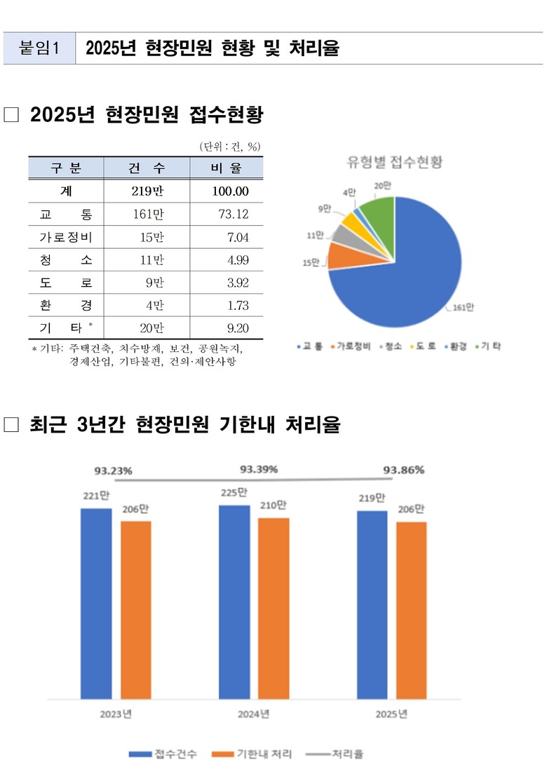 그 결과, 현장 민원 기한 내 처리율은 2023년 93.23%에서 2024년 93.39%, 2025년 93.86%까지 지속적으로 향상되어 민원의 신속하고 정확한 처리에 기여하였다.