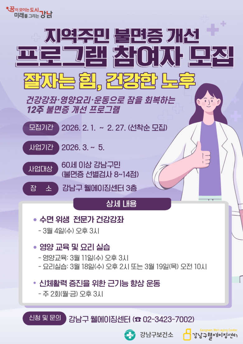 - 불면 경계군(지수 8~14점) 대상 사전 설문 선별…1기 과정 2월 27일까지 선착순 모집 - [강남구 세계타임즈=이장성 기자] 꿈이 모이는 도시, 미래를 그리는 강남구(구청장 조성명)가 60세 이상 구민을 대상으로 수면 문제 개선과 건강한 생활습관 형성을 지원하는 ‘불면증 개선사업’을 3월부터 강남구웰에이징센터에서 운영한다.
