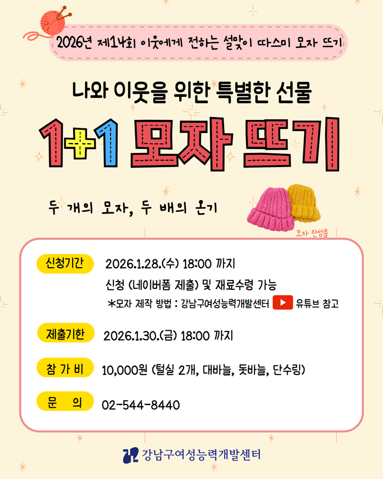 조성명 강남구청장은 “14년째 이어져 온 따스미 모자 뜨기는 주민의 손으로 만드는 강남의 대표적인 겨울 나눔”이라며 “주민이 직접 뜬 모자가 어르신과 장애인 등 취약계층의 겨울철 보온과 건강에 보탬이 되길 바란다”고 말했다.
