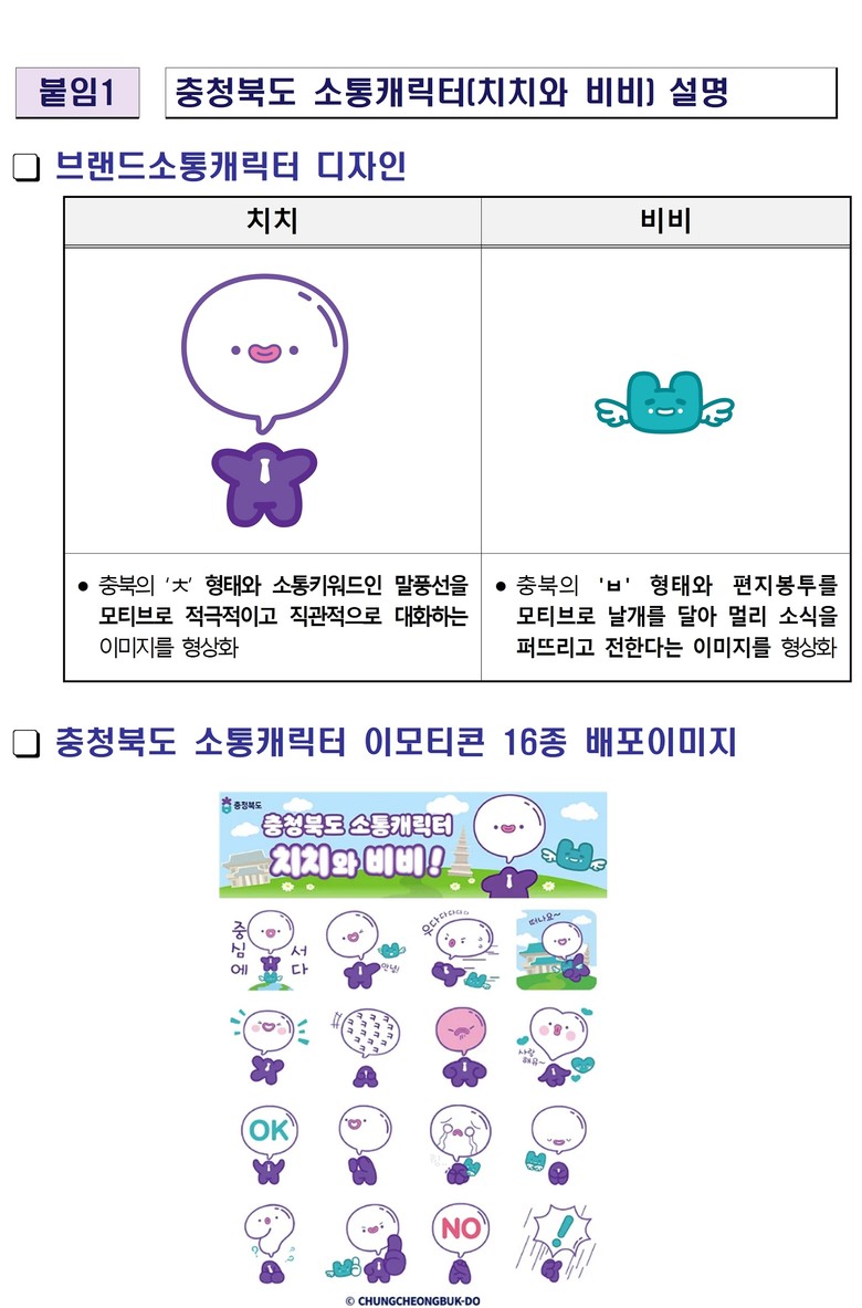 ‘치치비비’는 이번 이모티콘 배포를 시작으로 충북도의 브랜드 홍보, 캠페인 등 다양한 콘텐츠를 개발하여 활용될 예정이며 누구나 사용할 수 있도록 충청북도 소통 플랫폼 누리집에 공유할 예정이다.