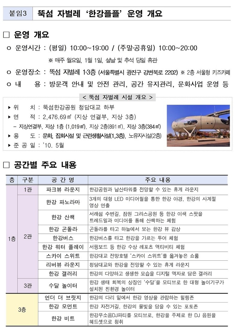 한강플플은 지난해 12월 뚝섬 자벌레에 새롭게 조성한 체험형 복합문화공간으로, 한강을 배경으로 놀이와 체험, 미디어 전시 등 한강의 다양한 콘텐츠를 한곳에서 만날 수 있다. 개장 이후 1월까지 약 7만 4천여 명이 방문하며 시민들의 높은 관심과 호응을 얻고 있다.