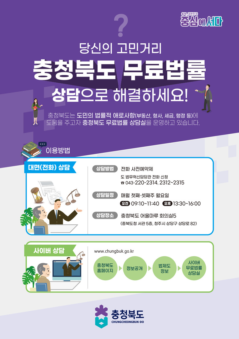 충청북도 무료법률상담실은 충북도민 누구나 일상생활과 관련하여 발생하는 법률문제(부동산, 형사, 세금, 행정 등)를 편리하게 상담받을 수 있도록 다양한 법률서비스를 제공한다.
